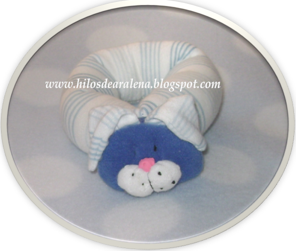 En muchas tiendas de bebe he visto estos sonajeros pulsera , que tienen por ojos unas mostacillas. Personalmente prefiero ( y así los hice) bordar los ojos con hilo grueso. Pueden hacerlos con punto nudo o si se animan con punto gusano ( el que se usa para las flores rococó).