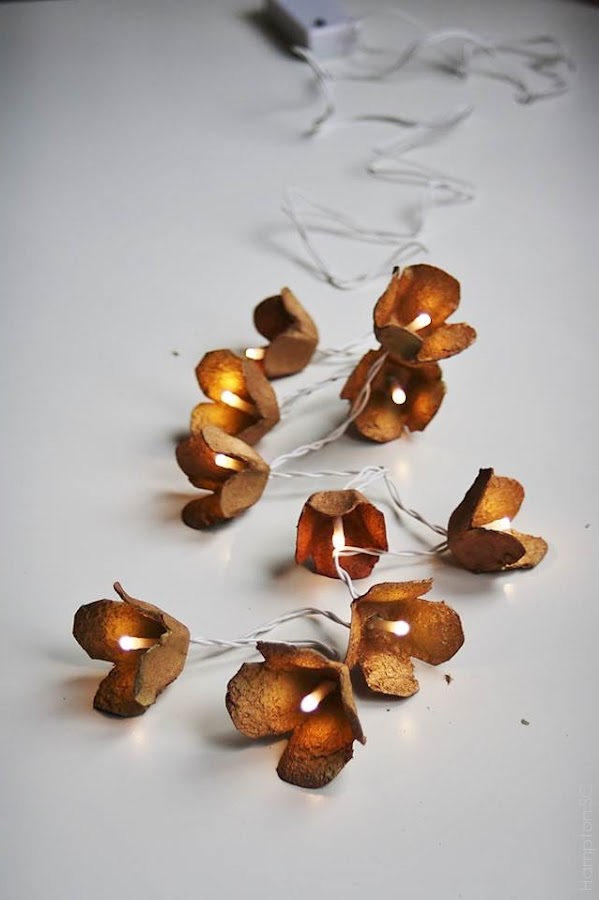 Esta guirnalda con luces la he encontrado en Hampton sc y está hecha con los cartones de los envases de huevos. En el blog la presentan como un adorno navideño, pero a mi me parece que se puede utilizar como elemento decorativo en cualquier época del año.