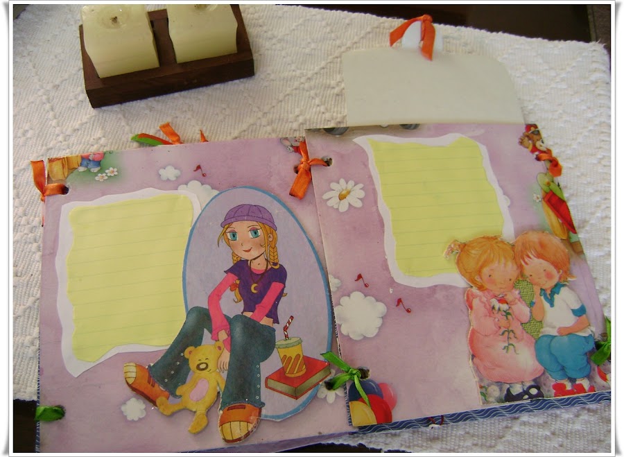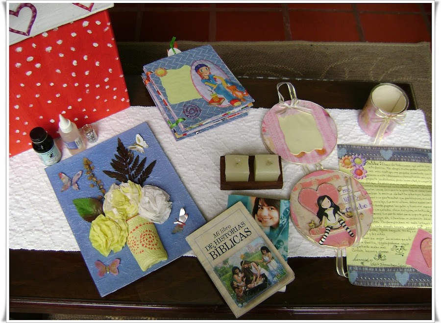 Aqui mis regalitos, un cuadro reciclado con las mariposas que nos enseñó a hacer con una lata de gaseosa, un portanotas con mi nick, un portalápices, un álbum para fotos, un libro de historias bíblicas, otro que se llama Lo que los jóvenes preguntan... se ve muy interesante, unas velas con su base para tunear, un betún de judea, un craquelador de un paso y un frasquito con escarcha, qué cantidad de cosas no? que afortunada que soy,jaja.