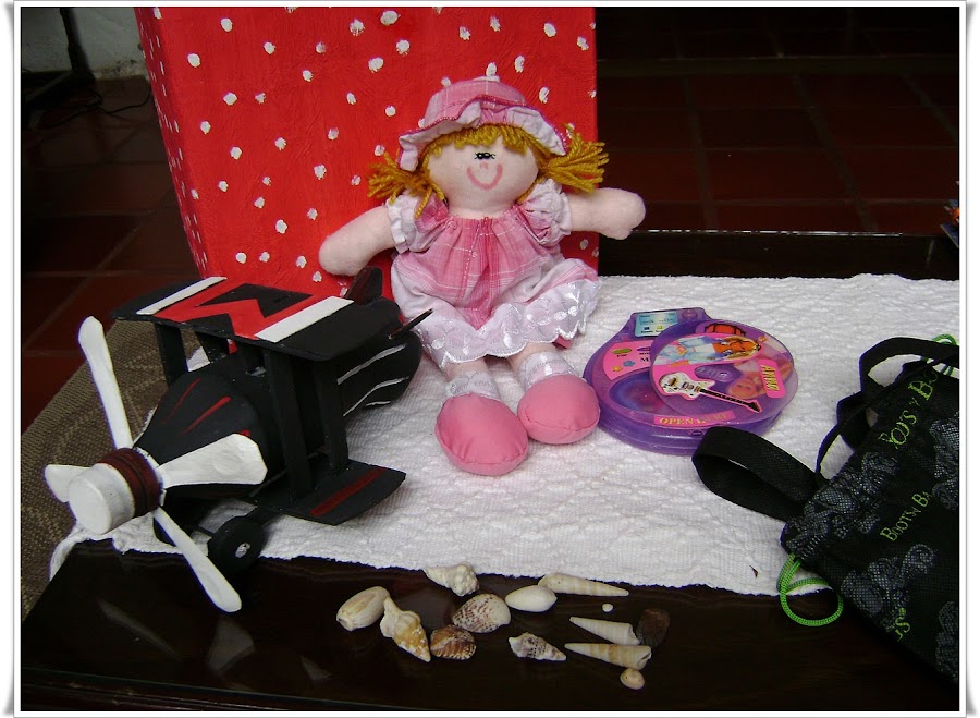 Estos son los regalos de mis hijos...Un avión hecho con un envase de coca-cola, una muñequita, un reproductor de cds de juguete, la bolsa donde venía la muñequita y conchas y caracoles del mar que Hanna tiene muy cerca. Mi hija no ha hecho sino trastearlos de un lado a otro a penas los he podido ver.