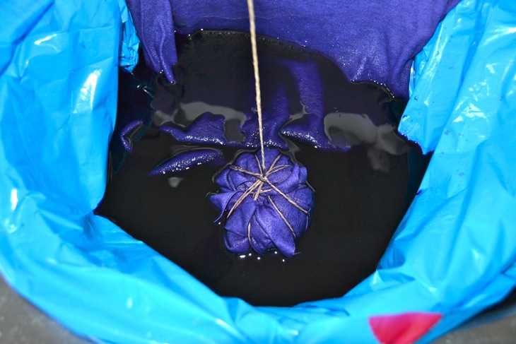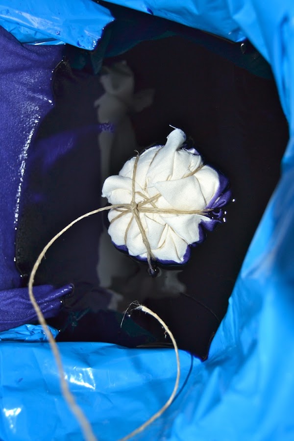En mi caso no he hecho los clásicos pliegues, sino que he hecho una bola arrugada que he atado con una cuerda y que he sumergido en el tinte, preparado previamente...