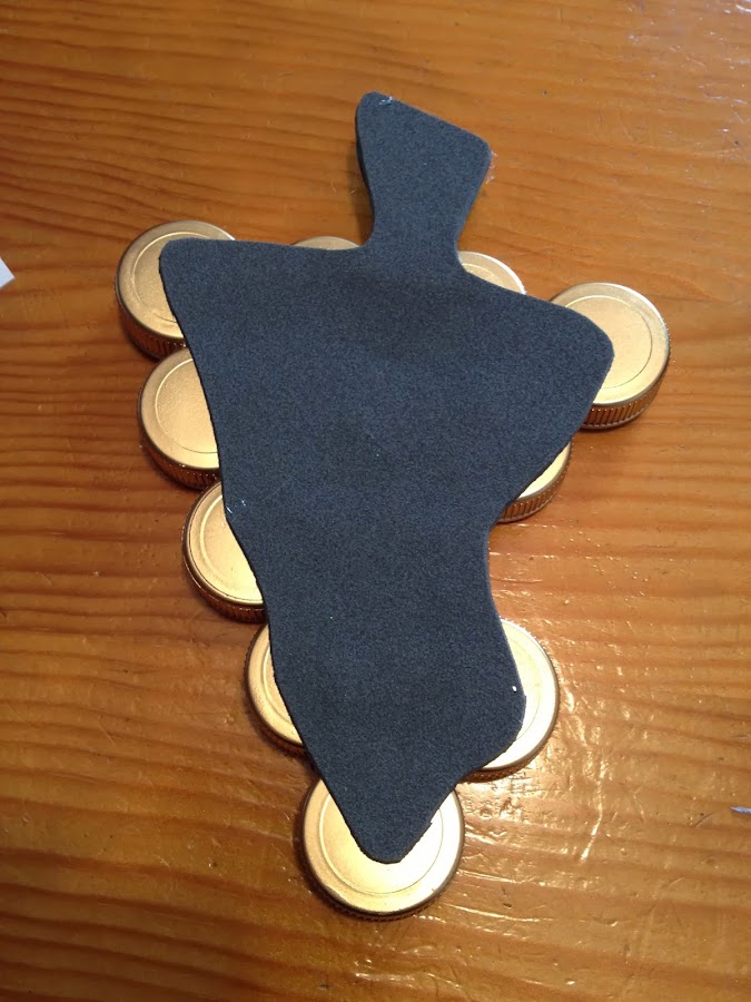 Situa los tapones en posición formando el racimo, guiate por la foto, y comienza a pegarlos entre ellos dos a dos, comenzando por los de la linea de arriba (está formada por 4 tapones), a continuación pega la segunda linea (3 tapones) tienes que poner puntos de pegamento caliente en las zonas de unión de los tapones.