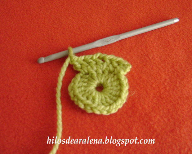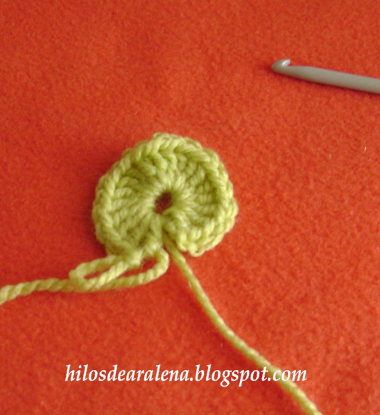 Después tiramos del extremo de la lana de la anilla para cerrarla y con punto enano terminamos la vuelta.