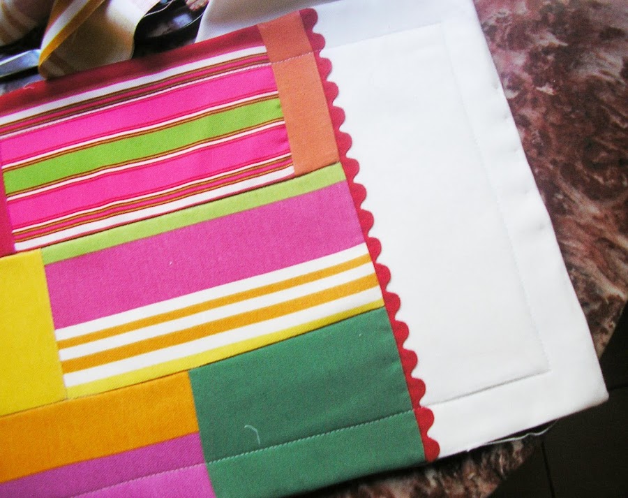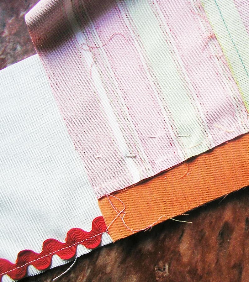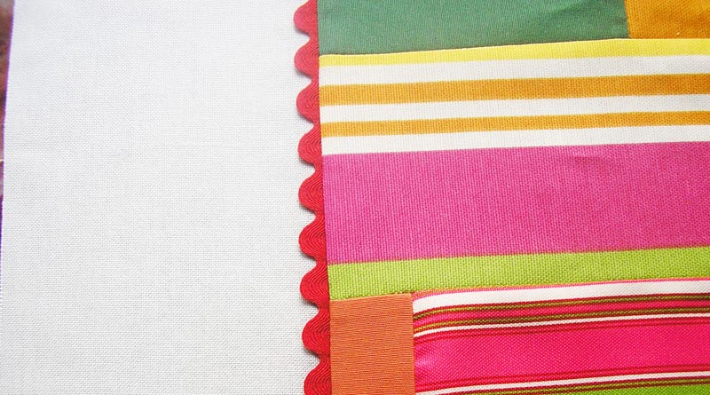 Puse este trozo de tela blanca con piquillo rojo. Primero coses el piquillo a la tela banca y luego a al parte de los trozos.