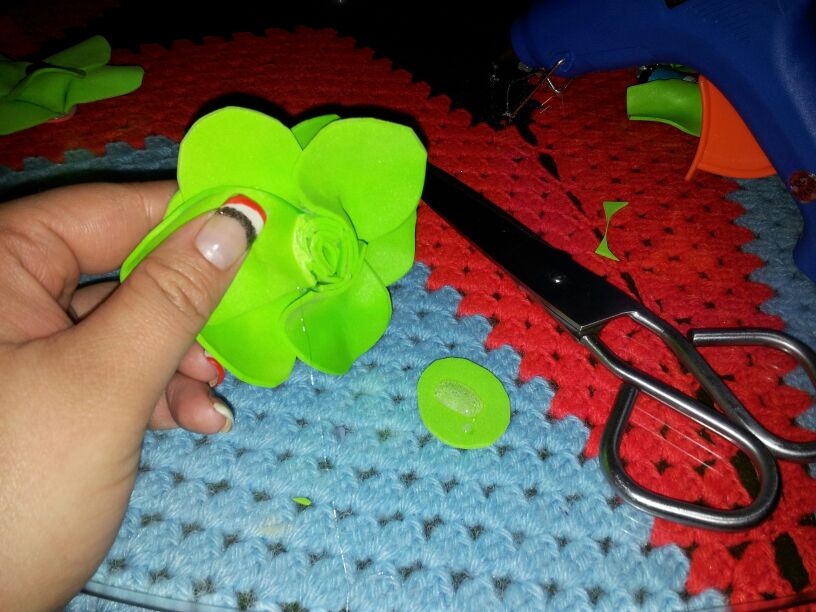 A continuación sobre esta parte central iremos pegando los pétalos poco a poco, con silicona.