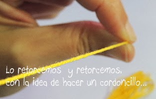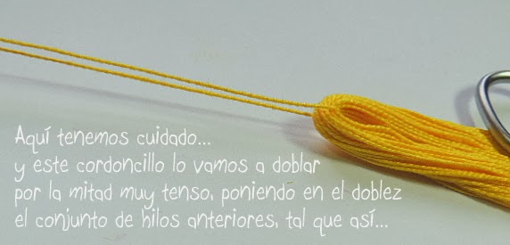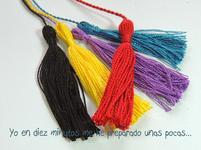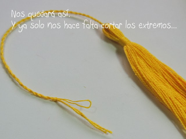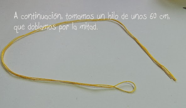 Este hilo que será el cordón de la borla, tendrá una largura de tantos cm x 4. Por ejemplo si queremos que la borla tenga un cordón de 10 cm, el hilo será de 40 cm.