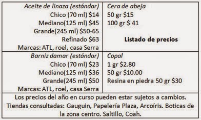 En las recetas propuestas se busca accesibilidad económica. Los ingredientes son usados comúnmente como medios de óleo y se venden en tiendas de arte; las ceras y resinas se encuentran en boticas a precios considerables.