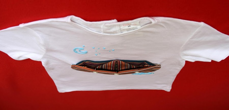 La primera que os enseño es la del pequeño, que ha sido un nuevo modelo que se me ocurrió. Llevaba ya algún tiempo con la idea de hacerla y ahora encontré la oportunidad perfecta para llevarla a cabo. A esta camiseta la he llaado "Había una vez una barquito chiquitito...". Os enseño las fotos y no me lío más: