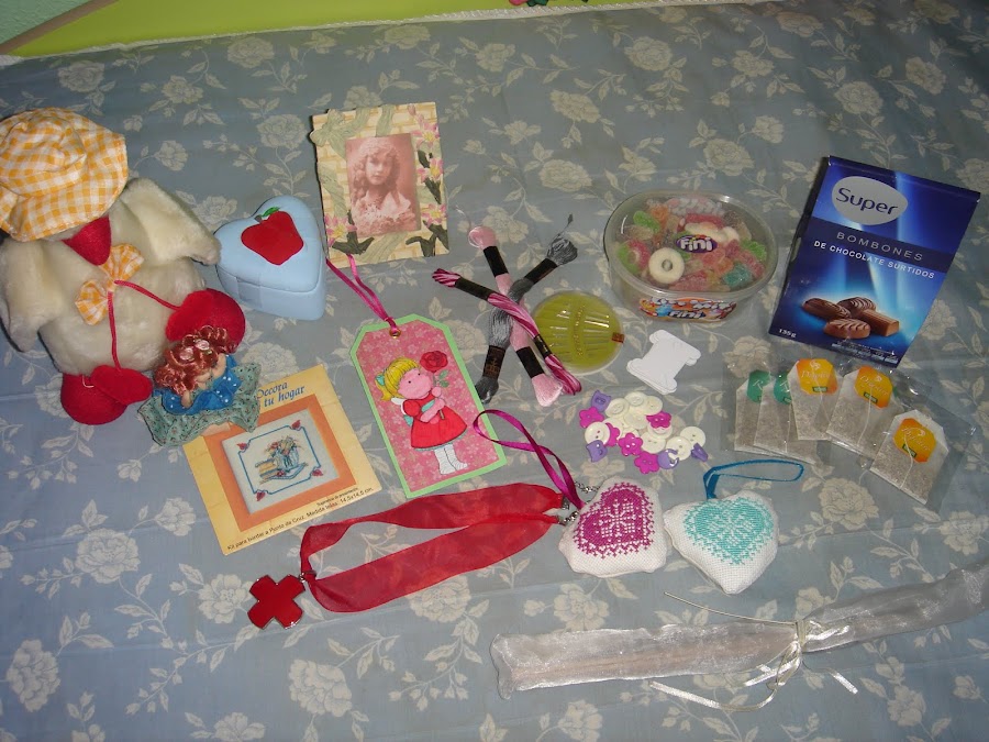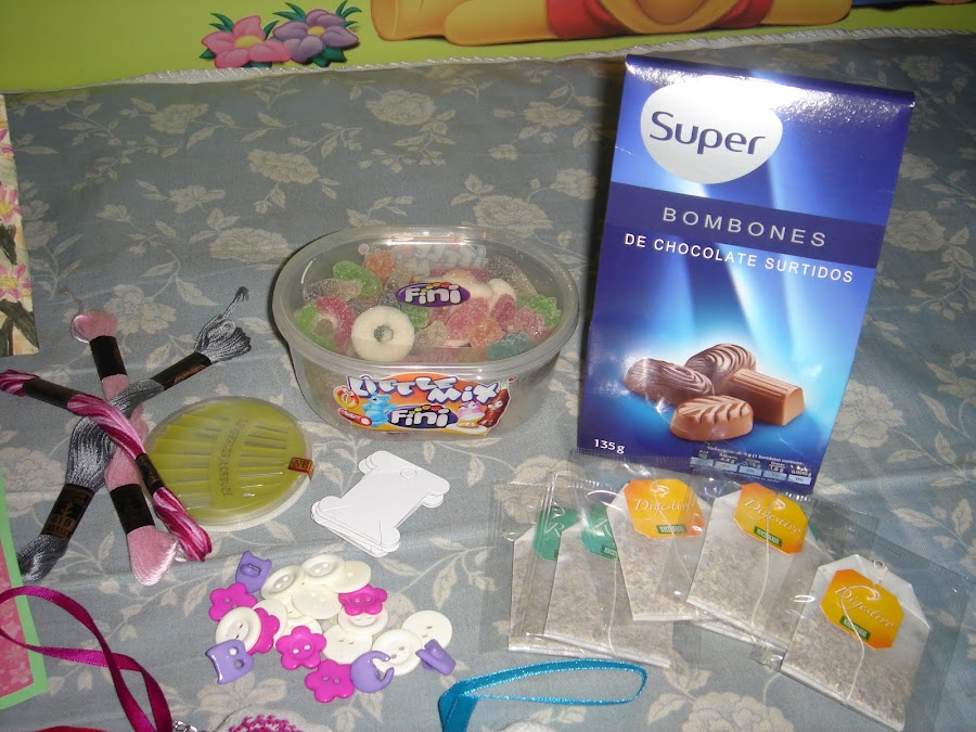 El resto son los regalos obligatorios y algunas cositas que compré para ella. Las chuches que le mandé no son las de la foto, porque después de hacer las fotos, se me calló la tarrita y se rompió. Así que le compré otro paquetón de chuches más grande, que fue el que ella recibió, pero ya no le hice fotos.