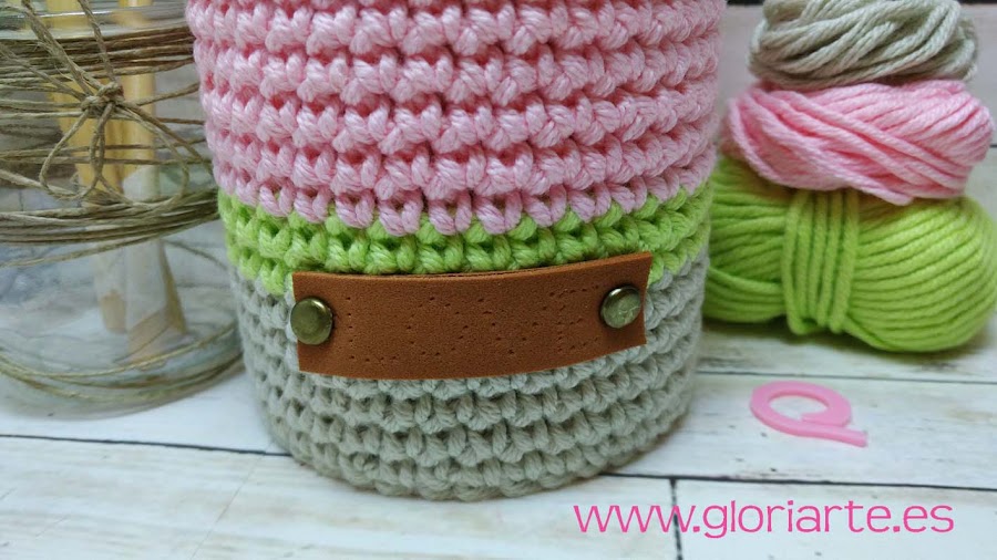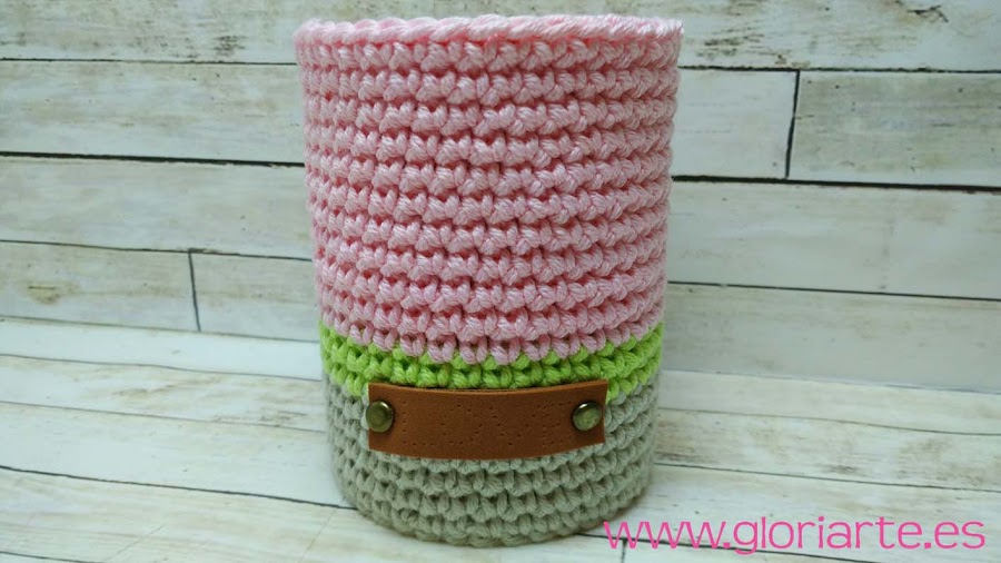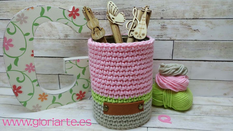 Puedes ajustar el tamaño de esta funda a la lata o bote que quieras utilizar, tan sólo hay que hacer más o menos cadenetas de inicio, dependiendo del tamaño de nuestro frasco, y realizar más o menos vueltas para llegar a la altura deseada donde quede cubierto todo el recipiente.