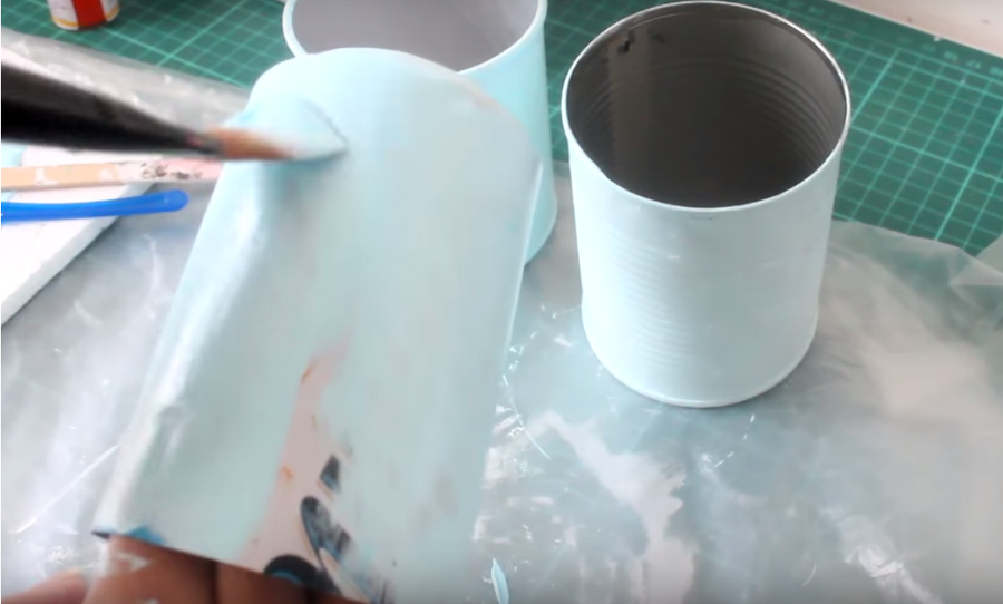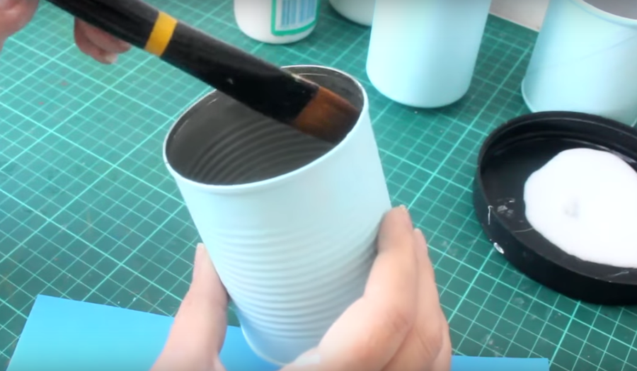 Para lograr el mordiente necesario para que la pintura acrílica se adhiera, voy a pintar las latas con barniz y diluyente al agua mate (puede ser barniz de cualquier tipo)..