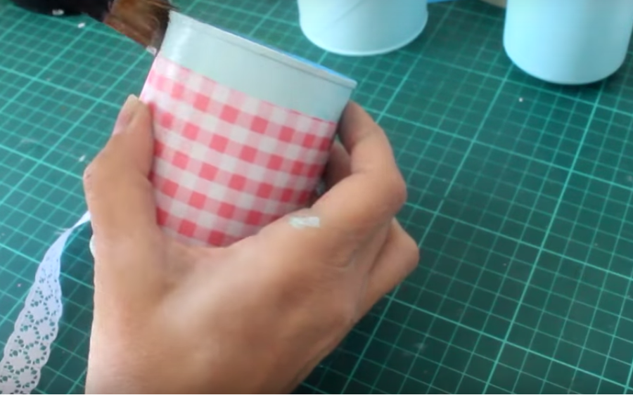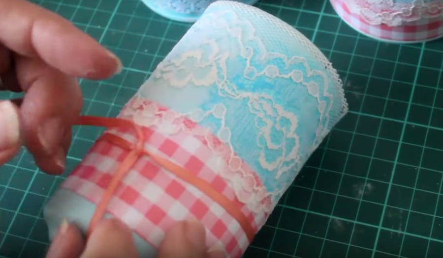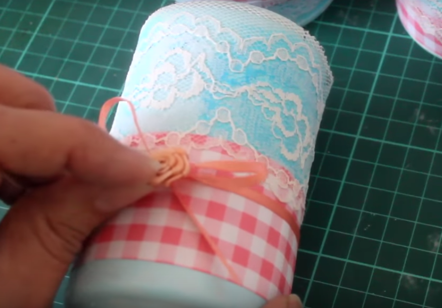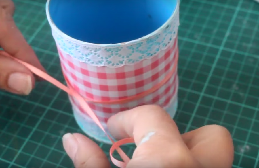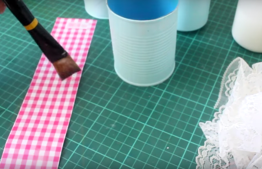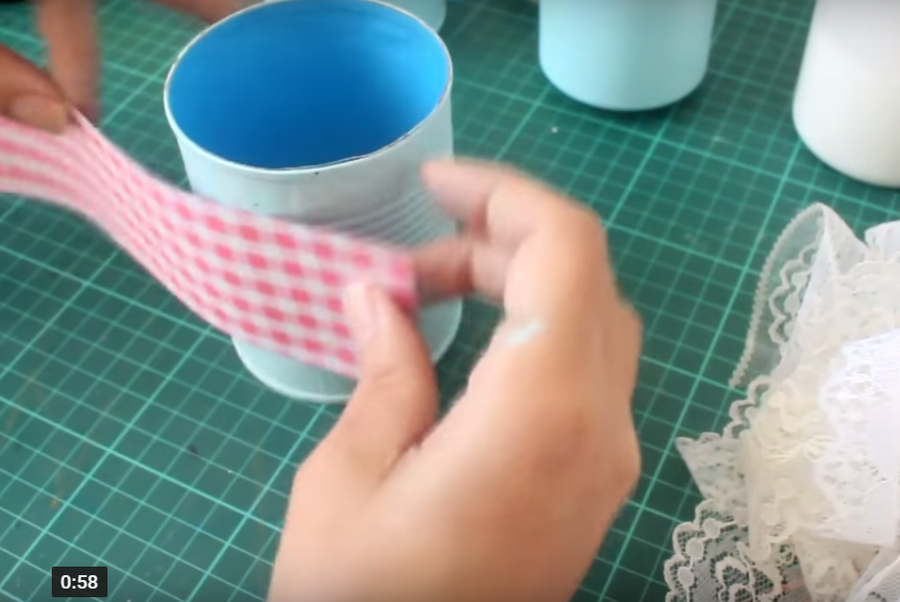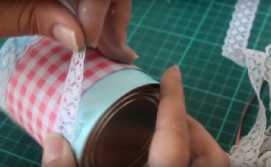 También aplico pegamento y coloco una cinta de puntillas tanto en la parte superior de la lata, cerca de la boca...