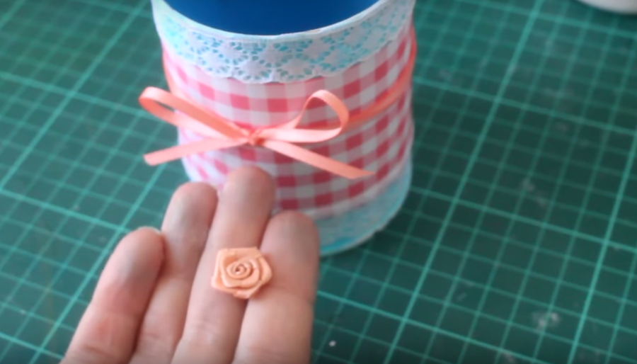 También decoro con la misma cinta y la misma rosita pero en la parte cercana a la boca de la lata..