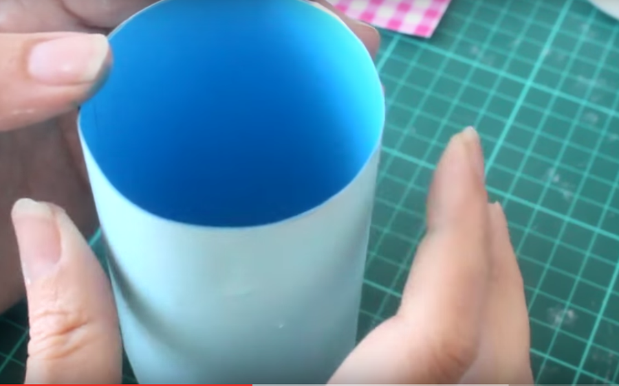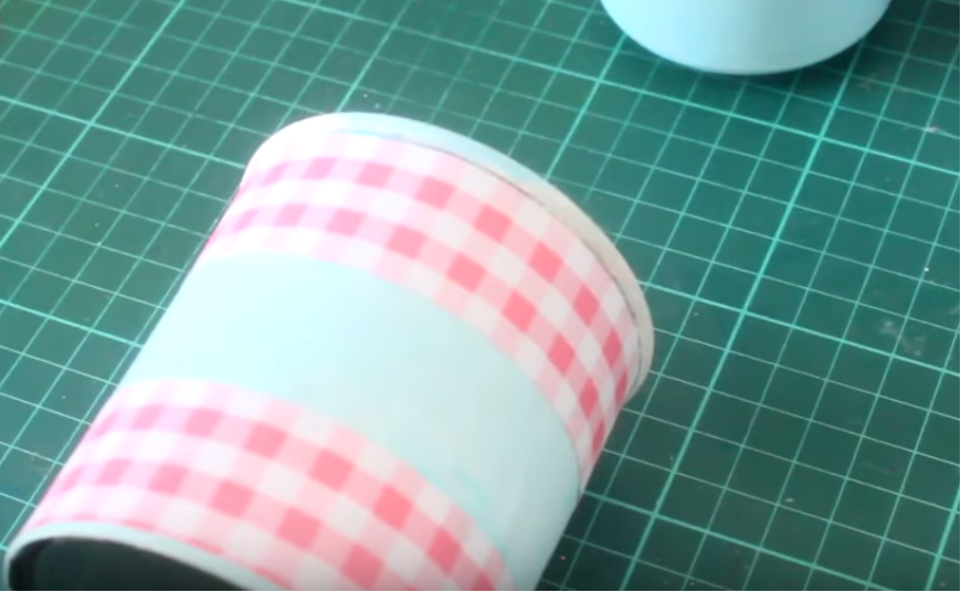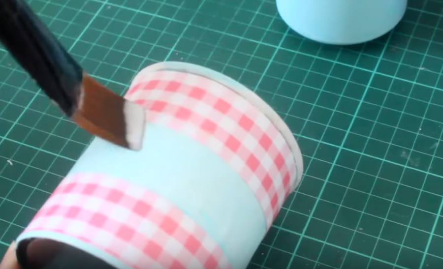 Para la decoración exterior, recorto una tira de cartulina decorada y le aplico pegamento...