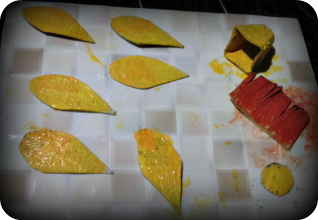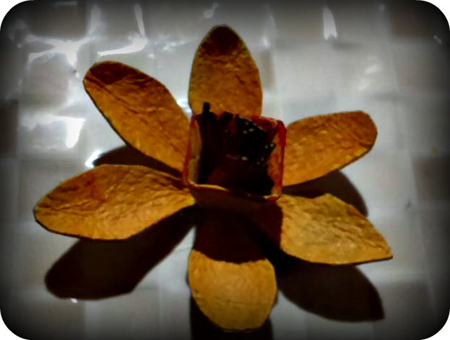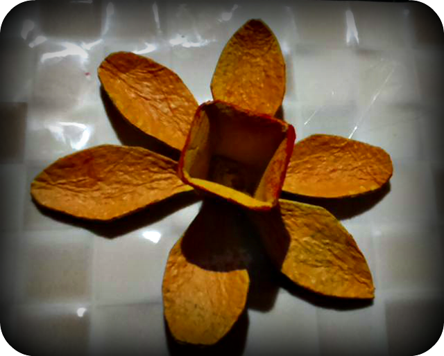 Con la parte lisa del cartón recortamos seis pétalos , con la forma similar a la que veis en la foto ( luego vuestra creatividad también puede jugar eh?.....)