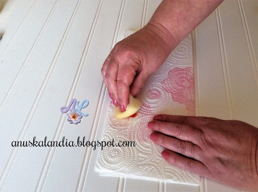 Tomamos un poquito de pintura, y descargamos dando ligeros toques en un trozo de papel de cocina, que tendremos preparado para tal fin.