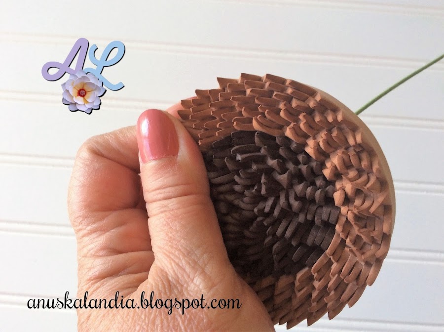 - Cogemos el alambre donde tenemos pegadas las piezas color marrón dentadas. Lo ponemos en la plancha, lo calentemos un poco. Retiramos. En ese momento pasamos los dedos anulares de ambas manos, por encima de la zona dentada, moviéndola hacia afuera. Moldear esta zona, da al girasol más realismo y sensación de movimiento. (por cierto, el que sujeta la plancha es el brazo de mi marido).