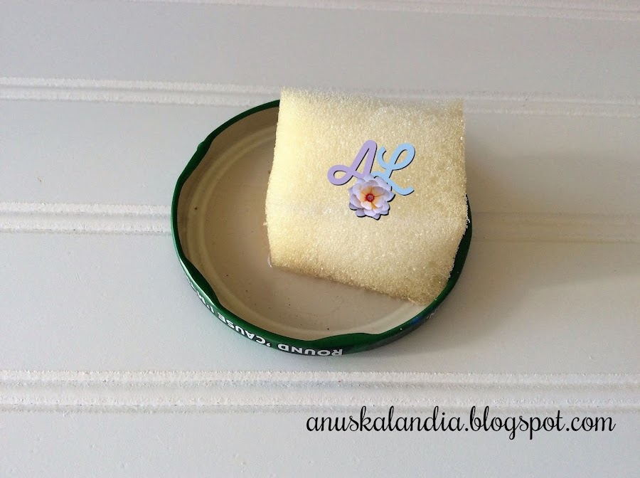 - Humedecemos el trozo de esponja que vayamos a utilizar en ese momento. Húmeda, no mojada, si fuera así el color quedaría aguado en nuestra goma eva. Descargamos el agua en el papel de cocina. En mi caso he utilizado la tapa de un frasco, para echar un poco de agua, lo justo para humededer.
