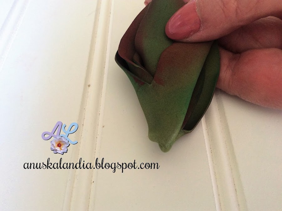 - En el caso de los pétalos, empezaremos a dar pintura, desde el centro hacía los pétalos, dejando la punta sin pintar de cada uno. Pintaremos todo el borde de cada pieza, como aparece en la última foto. Si no hiciéramos esto, el acabado no sería correcto, aunque parezca una bobería, cosas de este tipo marcan la diferencia. La atención al detalle es primordial. Además, pétalos, sépalos y hojas, van pintados todos por ambas caras.