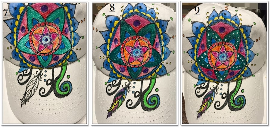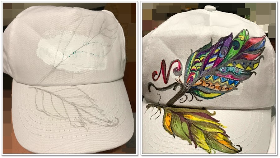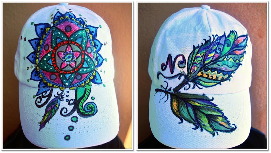 Cómo me dieron 2 gorras hice 2 diseños diferentes, una gorra para mí y otra se la regalé a mi hermana. Yo me quedé con la del diseño de mandala y a mi hermana le regalé la del diseño de plumas. Puedes dibujar lo que más te guste corazones, hojas, nubes, floresasí hasta el infinito. Elige el diseño más o menos complicado en función de tus habilidades.