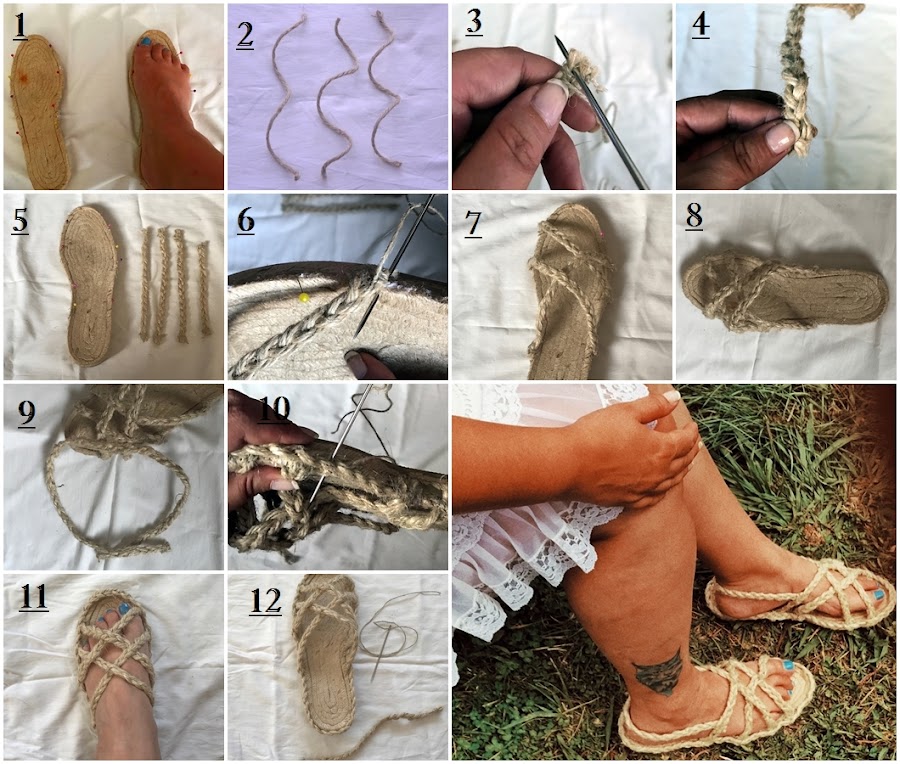 Tuve que ir a comprar material para hacer los bolsos y ahí encontré la solución. En la misma cuerda que utilicé para hacer los bolsos. Ese es el material adecuado para hacer las sandalias.