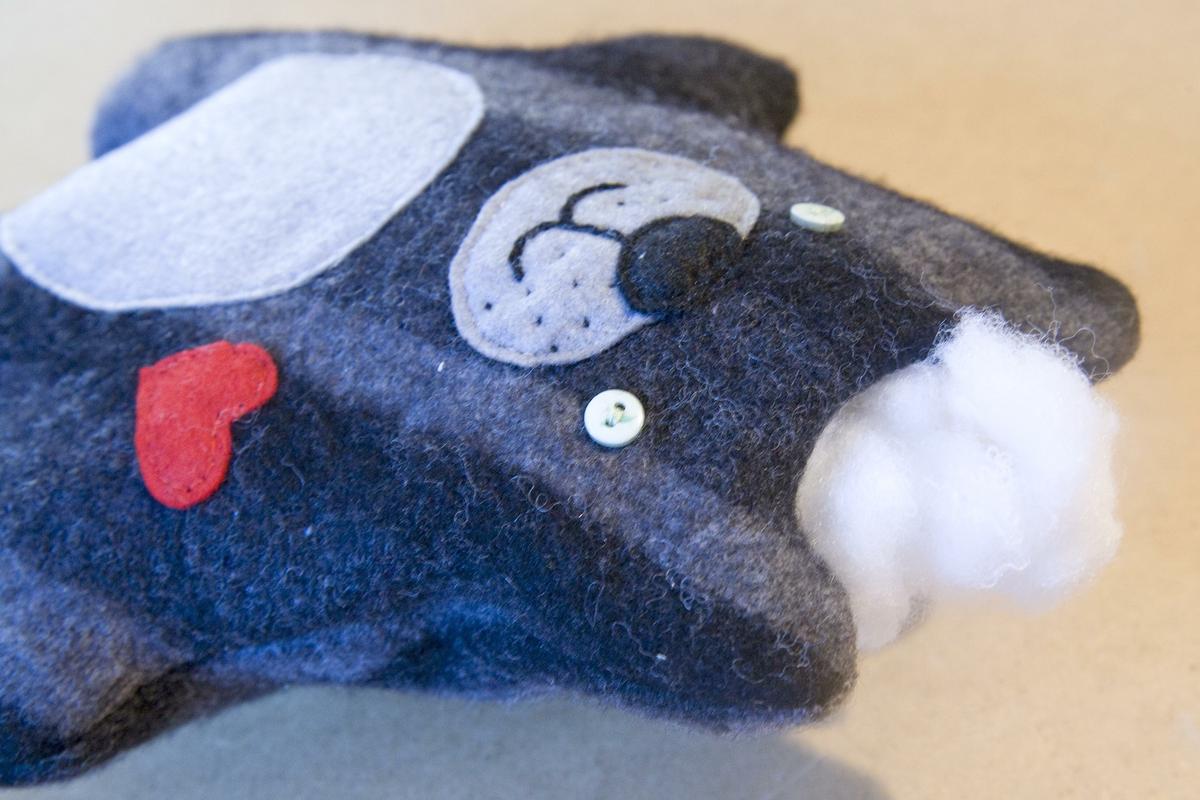Por el trozo que se ha quedado sin coser da la vuelta al muñeco, rellénalo y cierra el agujero cosiéndolo a mano.