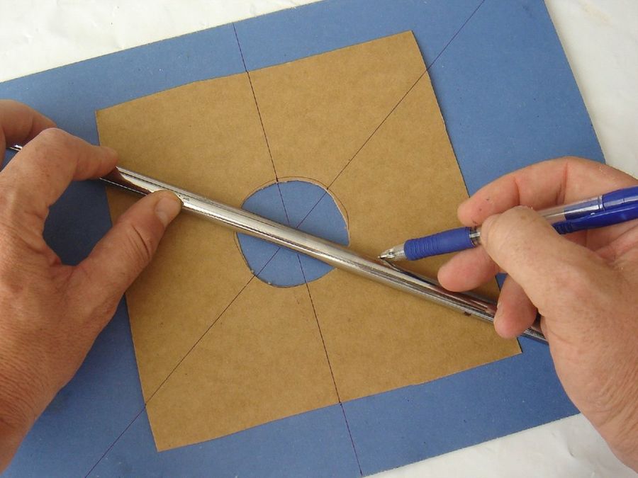 Empezamos la confección de la plantilla para el fuselaje. Nos ayudaremos con una carpeta de colegio, a la que trazamos las diagonales, y después una línea vertical en el centro. Ya podemos colocar encima un trozo de cartón de patrones, que por su rigidez nos servirá para la tarea. Tras hacerle un agujero central, marcamos las rayas de la carpeta.