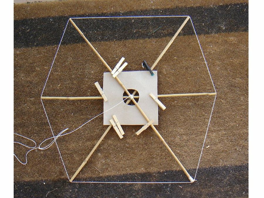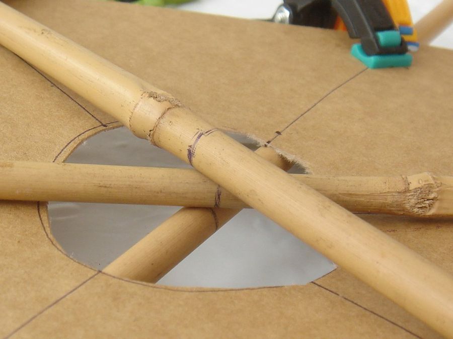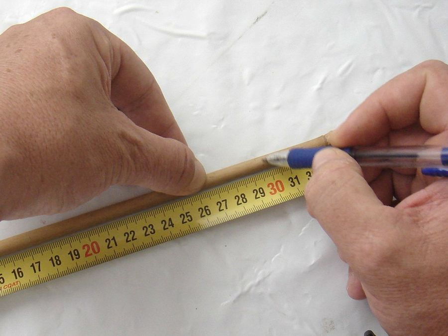 Como en todo artefacto volador, el equilibrio y la simetría son esenciales. Esto implica mediciones muy escrupulosas. Aquí estamos marcando el centro de las cañas, que será por donde las ataremos.