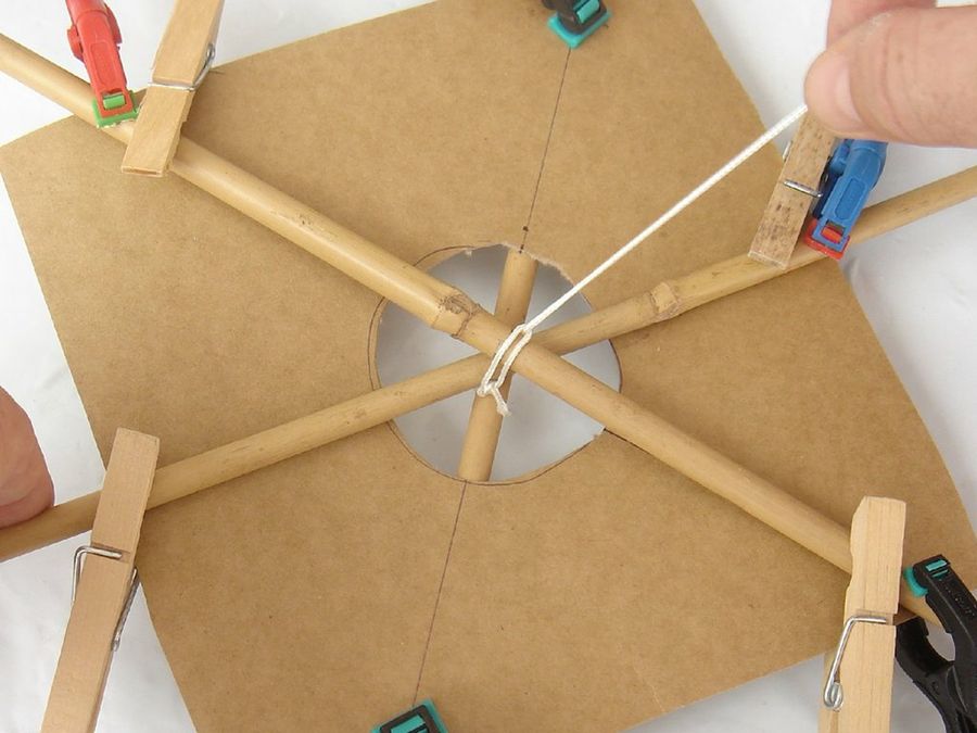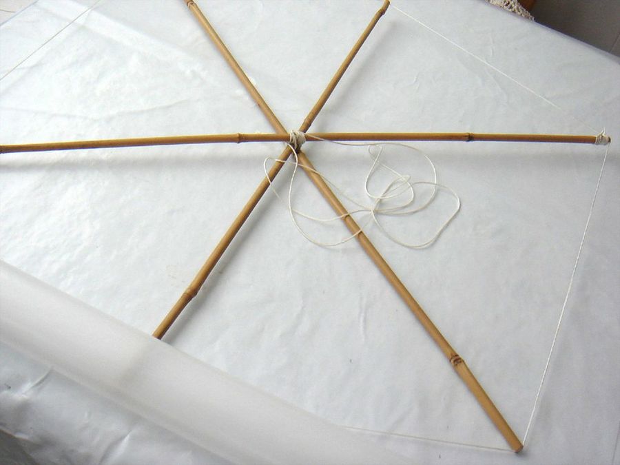 Ahora atamos las cañas por el exterior, metiendo la cuerda en cada ranura. Este sencillo armazón tiene una resistencia fenomenal, necesaria para batirse con el viento en las alturas. Hemos dejado el extremo del nudo central sin cortar, porque nos servirá luego para enlazarlo con el hilo de mando.