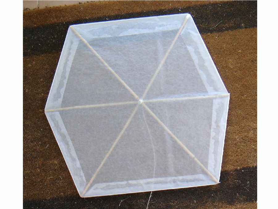 Quitamos la plantilla, cortándola con unas tijeras, y presentamos el hexágono sobre un pliego de papel cristal, tan bien conocido por los aficionados al aeromodelismo. Cortamos el papel alrededor del esqueleto, dejando unos centímetros de margen, y pegamos los dobleces, procurando dejar bien terso el papel.