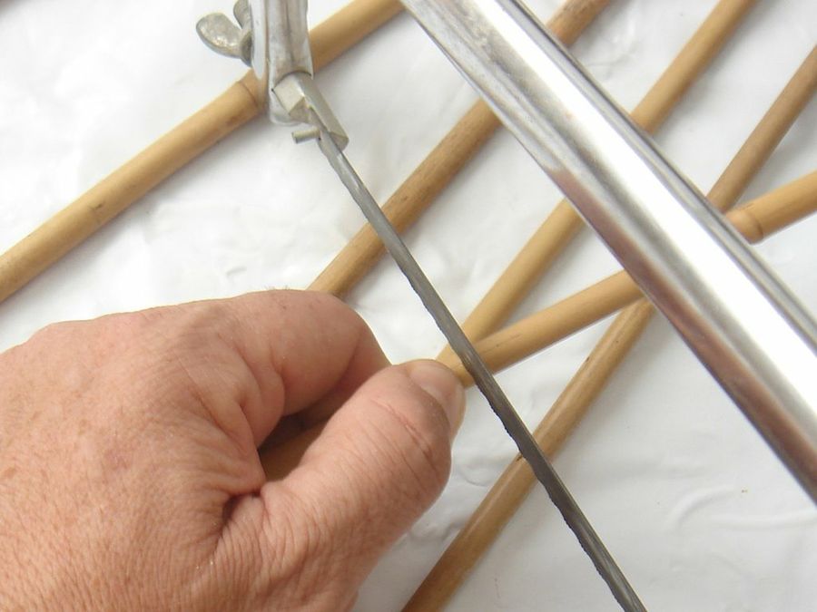 Marcamos la medida de 70 centímetros, que nos permitirá hacer una cometa o cachirulo de tamaño normal, y cortamos las cañas con una sierra de metal. A continuación, con la misma sierra hacemos por los extremos de cada caña una hendidura. Ese rebaje servirá para alojar la cuerda, que junto con las cañas formará el armazón de la cometa.