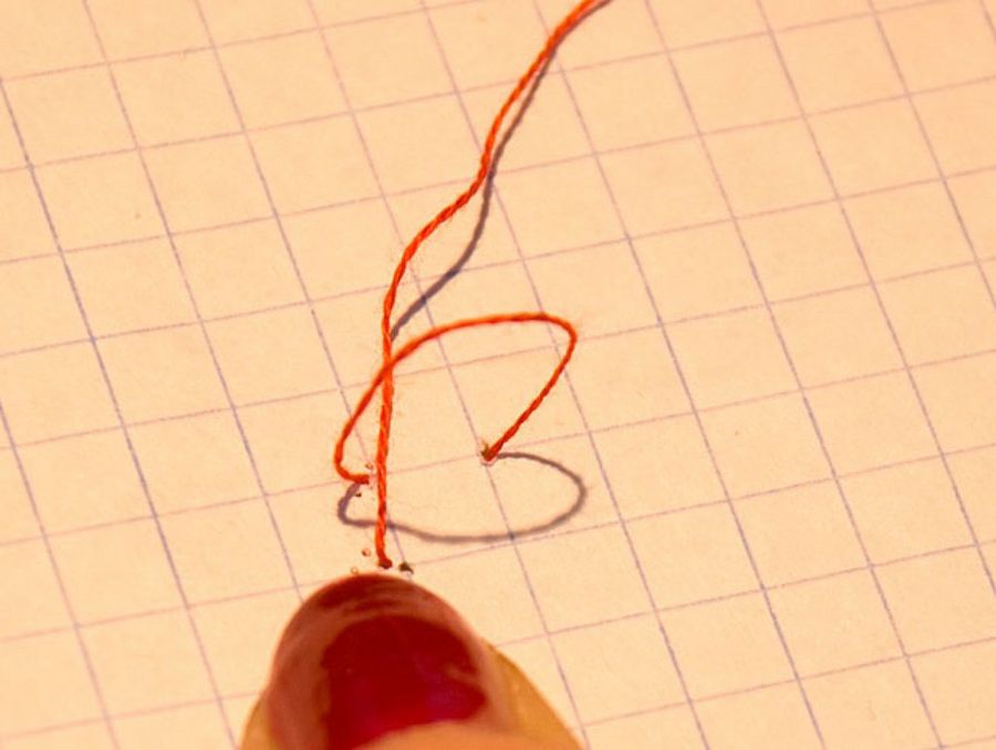 Observemos que detrás hemos formado un bucle. Metemos el extremo del hilo por dentro, y al tirar de la aguja se quedará presionado.