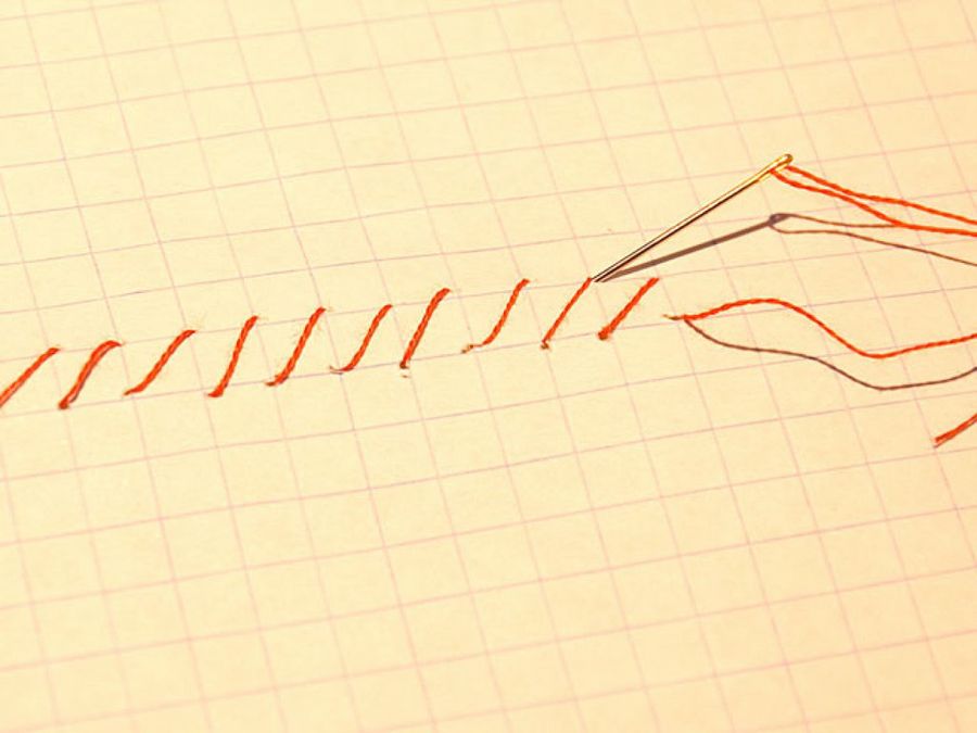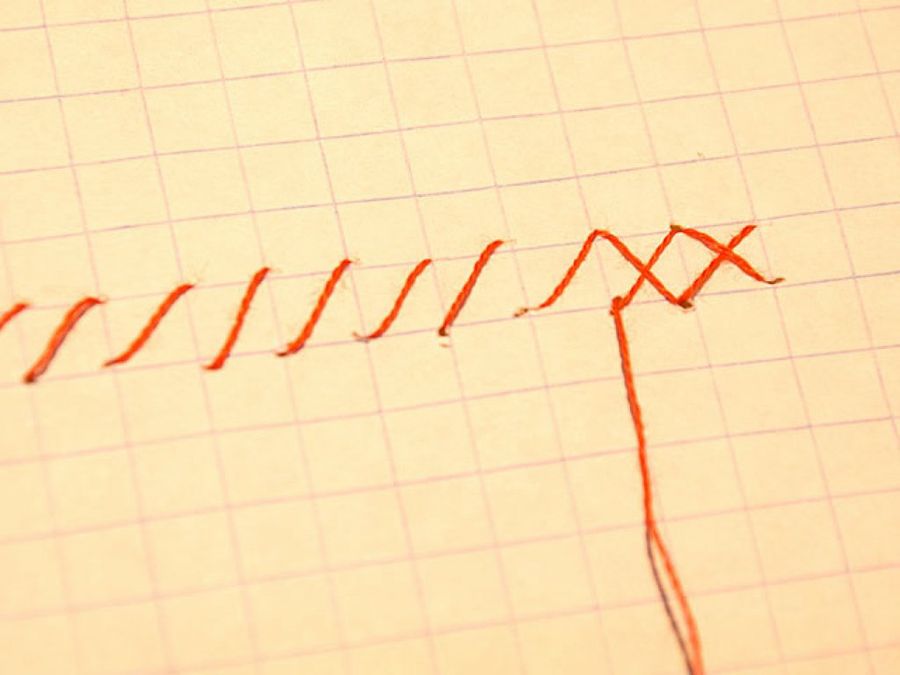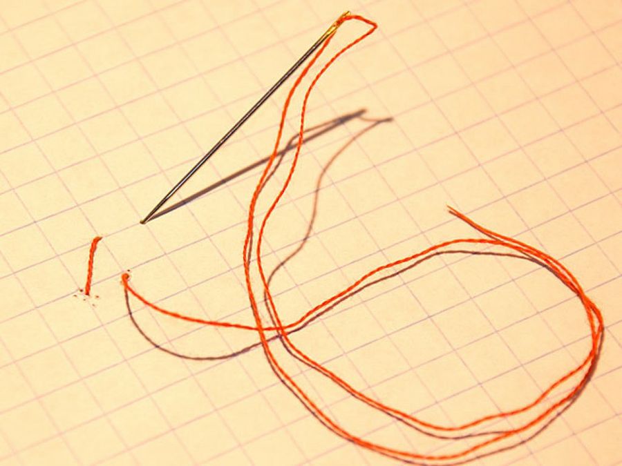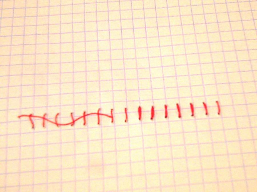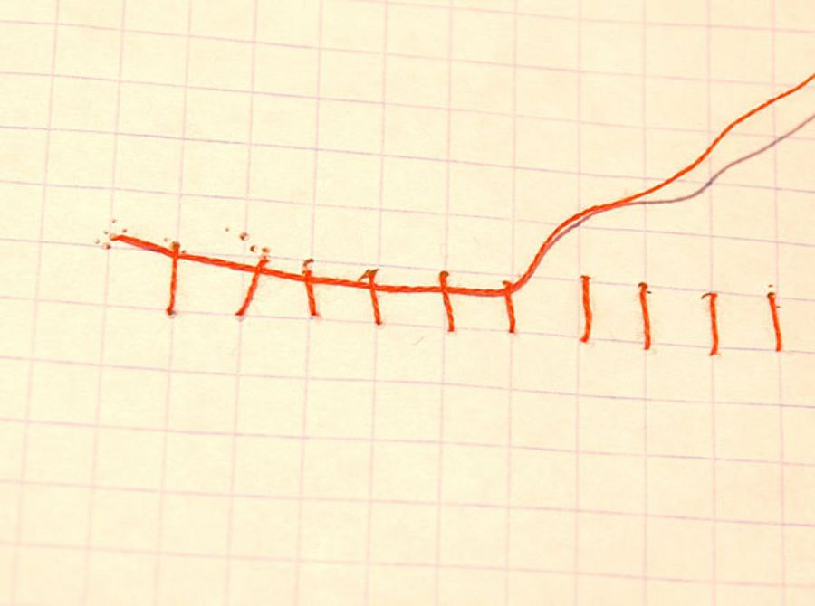 La vista posterior permite apreciar cómo se sujeta el extremo del hilo. Cuando llevemos varios puntos seguidos, “que parezcan una cicatriz”, explica gráficamente Viruca, podemos cortar el extremo del hilo. No hace falta que lo sujetemos todo, basta con lo suficiente para que no se deshaga.