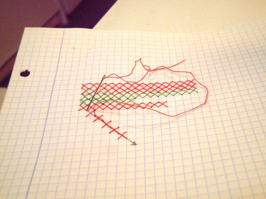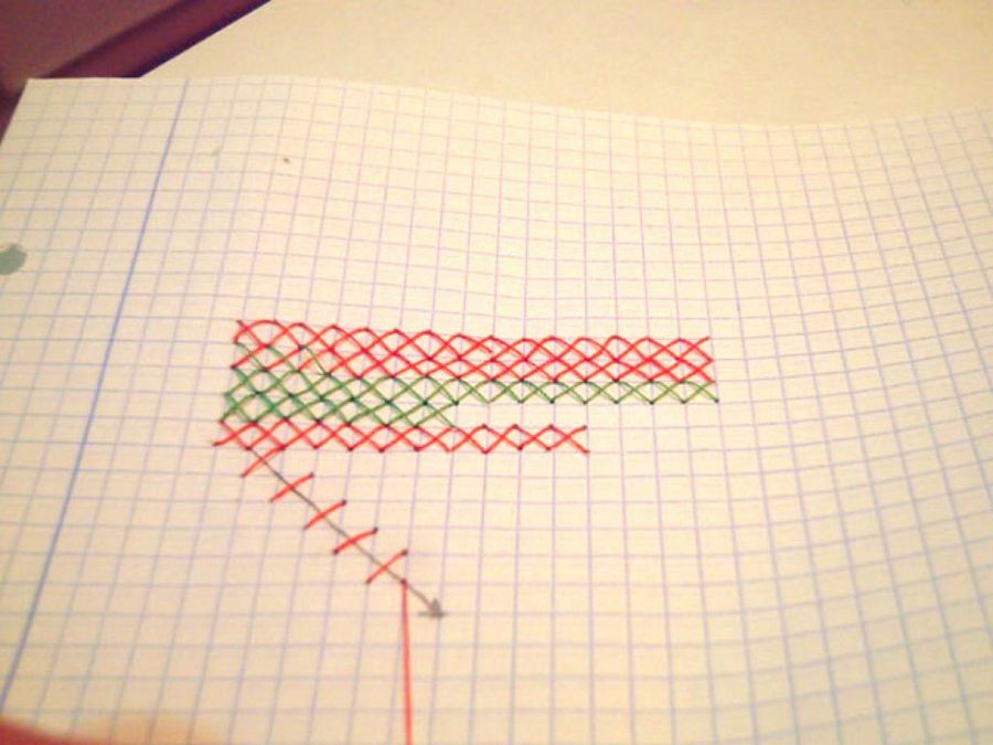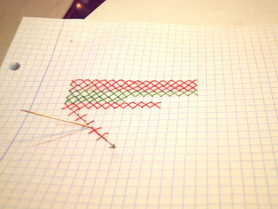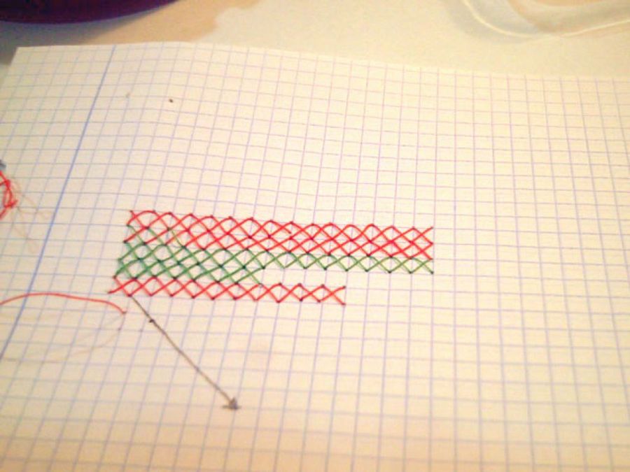 Y, tal como en el punto que dio comienzo a la labor, sacamos la aguja por el sitio correspondiente para comenzar una nueva diagonal.
