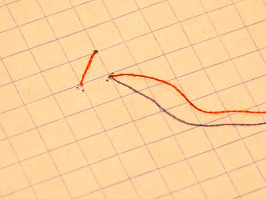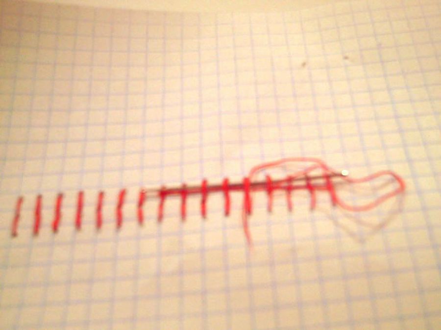 Para hacer el siguiente punto sacamos la aguja dos agujeritos más abajo y la metemos igual que en los anteriores. Así continuamos hasta cubrir toda la longitud del segmento.