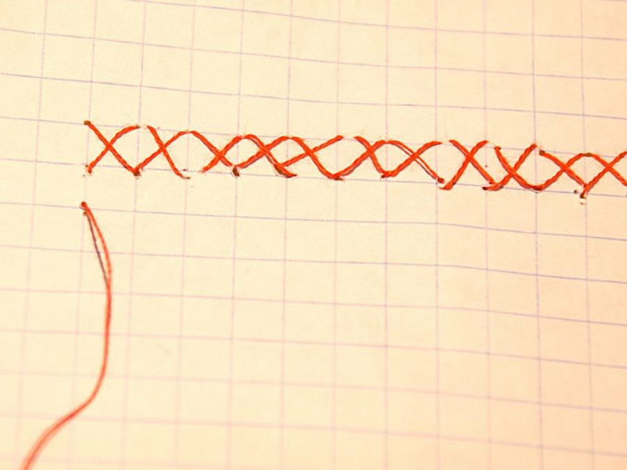 El primer paso es meter la aguja por un agujero en el reverso de la tela y sacar el hilo por delante, dejando un ‘rabito’ al otro lado. En el punto de cruz, al extremo del hilo no se le hace nudo.