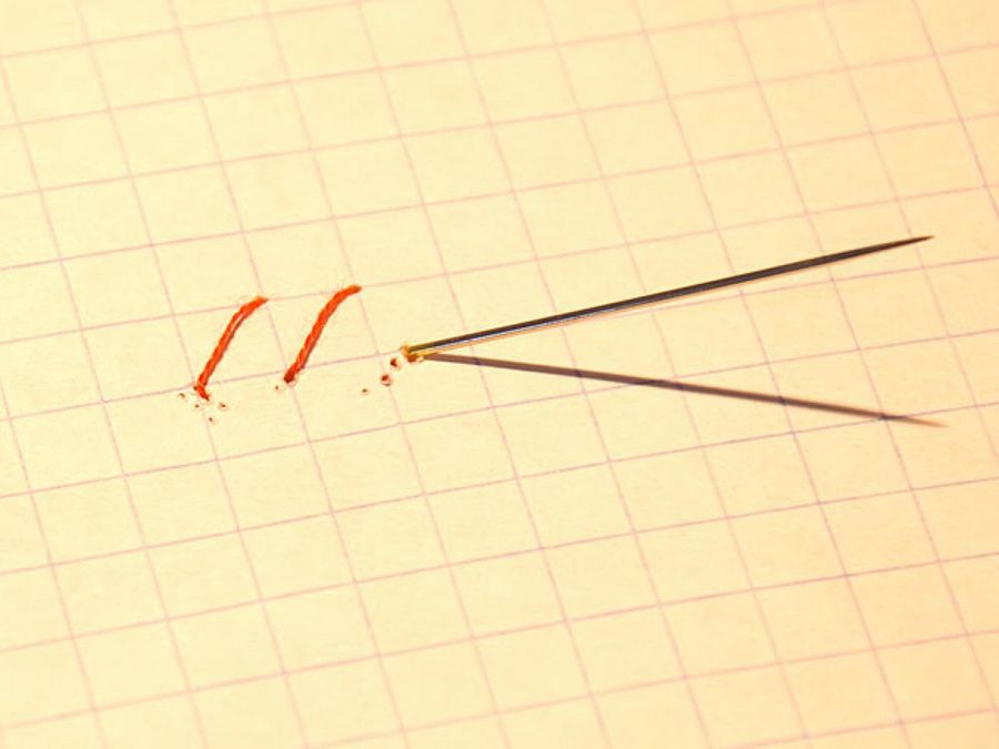Sacamos la aguja por el agujero que está justo debajo del anterior.