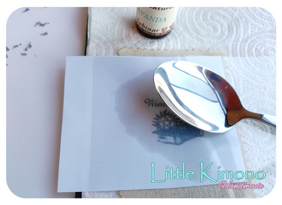 3. Rápidamente colocamos el trozo de acetato encima, que nos servirá para proteger el papel ahora que frotaremos con la cuchara tooooda la imagen para que se transfiera.