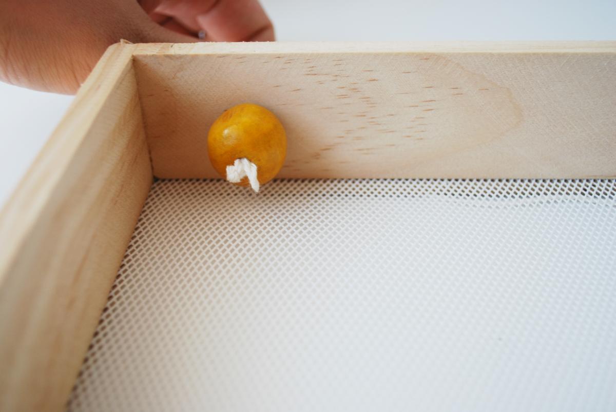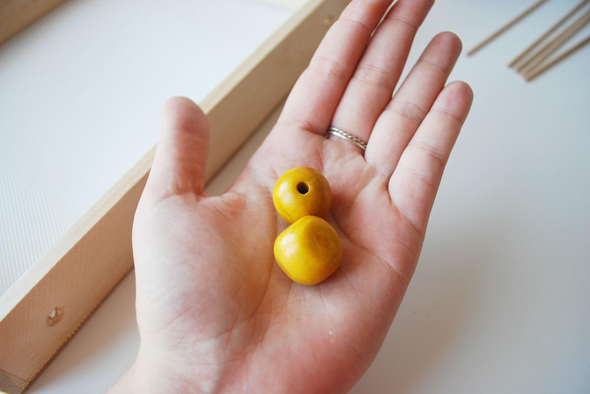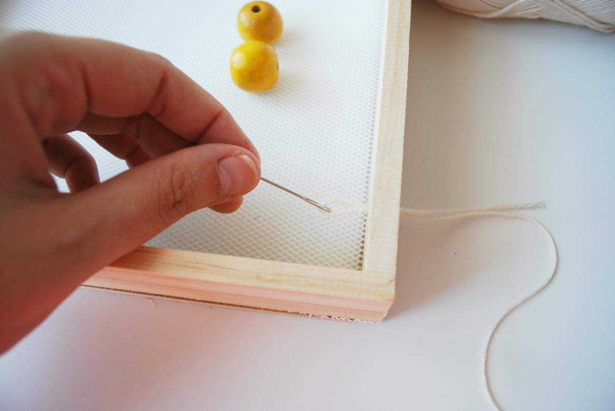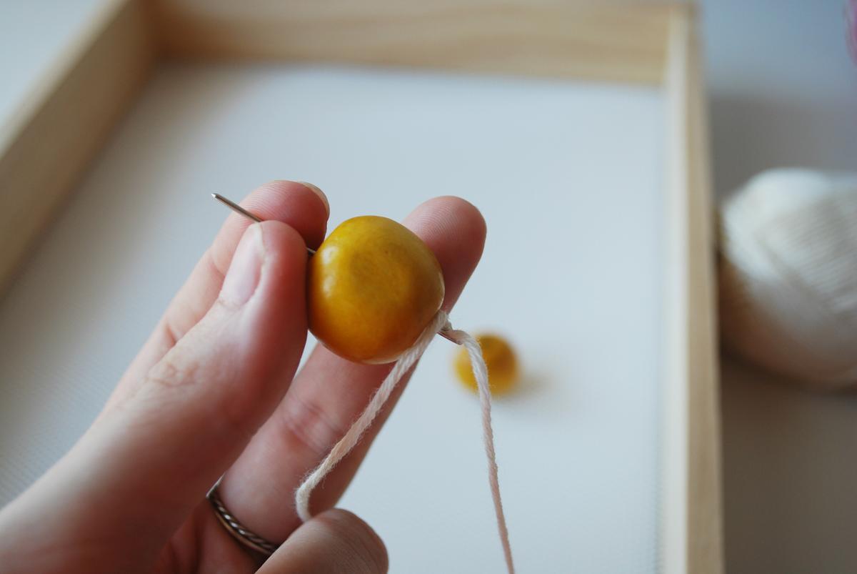 Con ayuda de una aguja lanera, pasaremos el hilo por el agujero de la base y por la bola de madera y lo aseguraremos bien con un nudo grande.