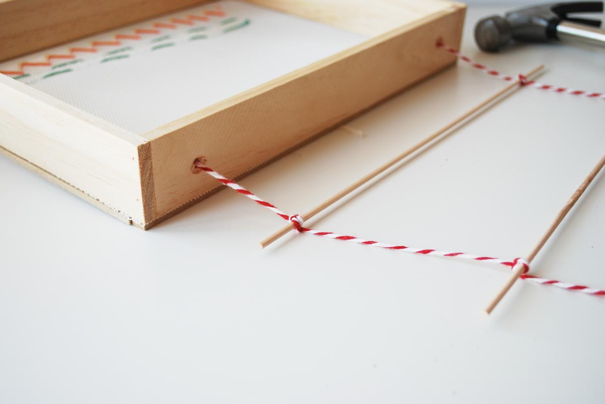 Ahora viene la parte más díficil para mi, y es colocar los palitos de madera (y que queden rectos). Podemos poner primero todos los de un lado y después ir haciendo los nudos del otro lado. Yo la verdad es que no he encontrado ninguna fórmula mágica para hacer los nudos bien rectos, así que es cuestión de ir probando sin apretar mucho hasta que nos guste el resultado.