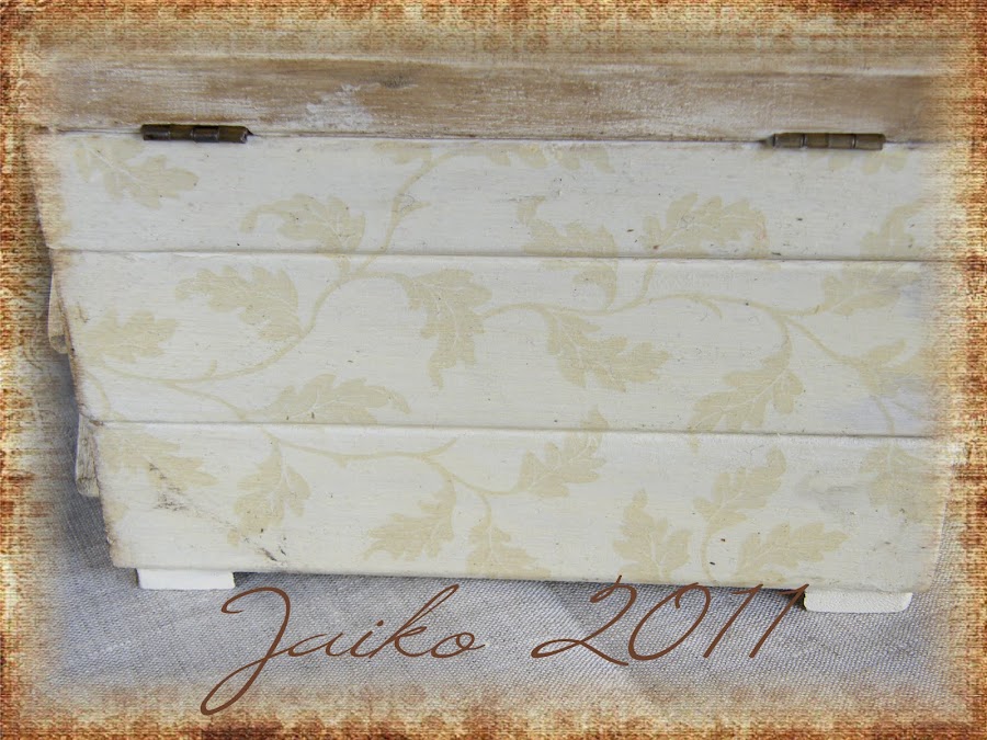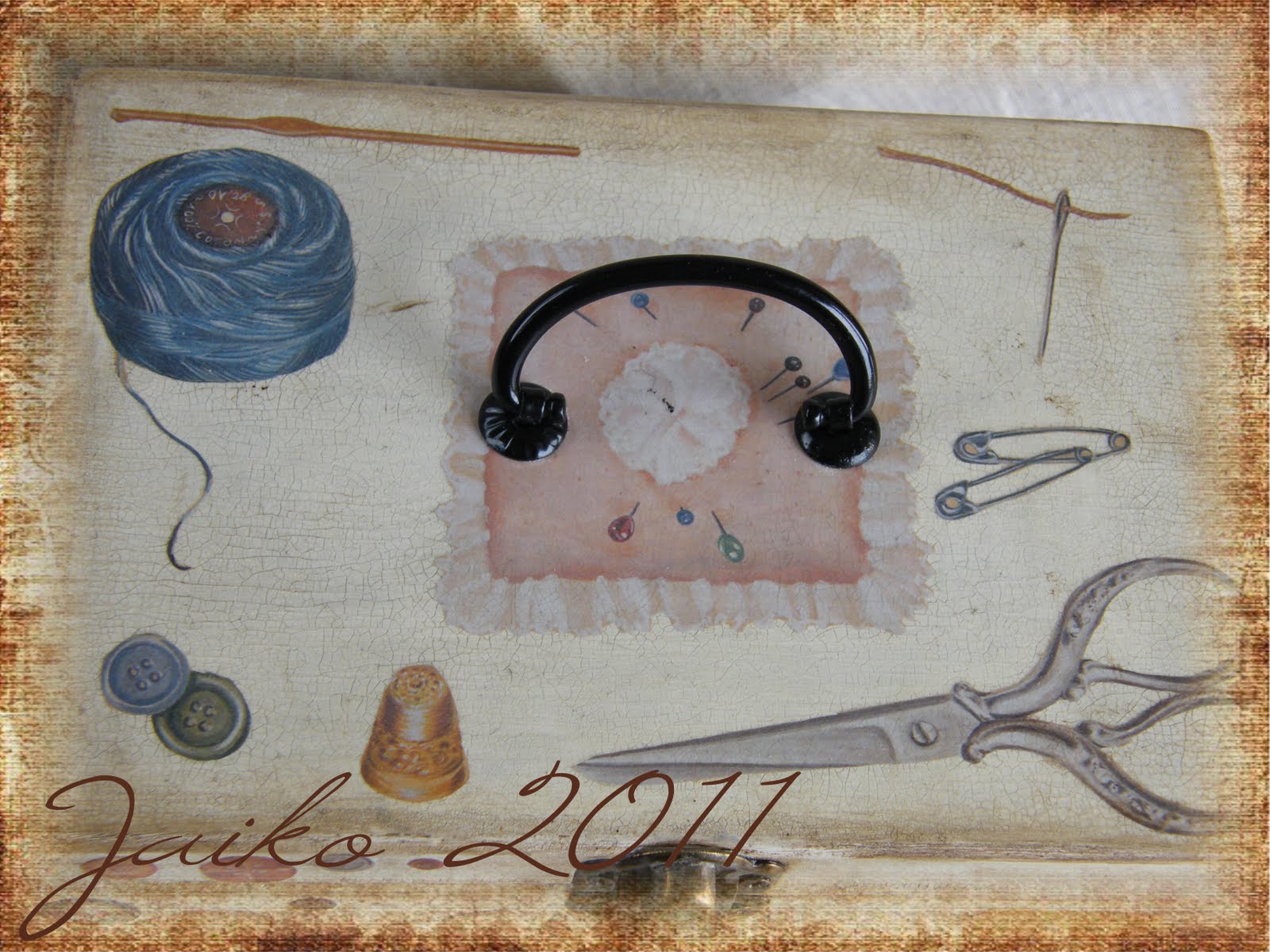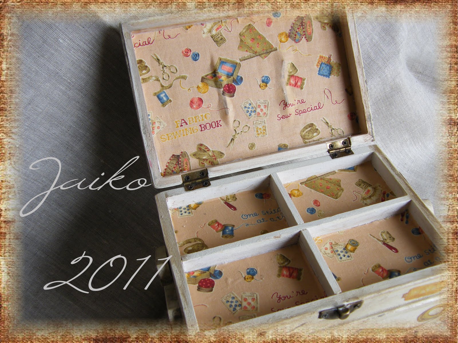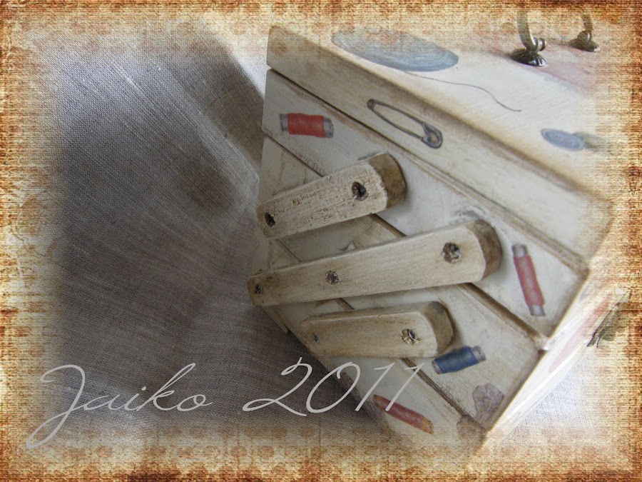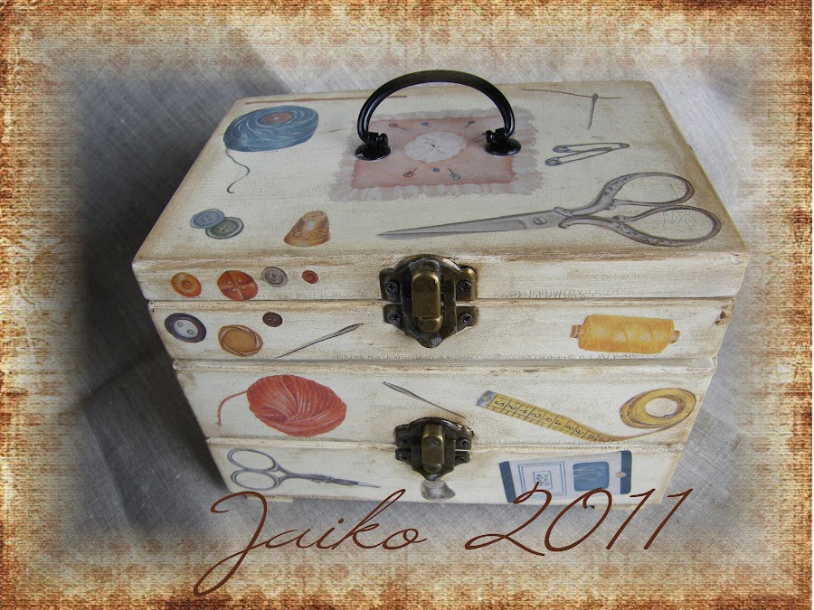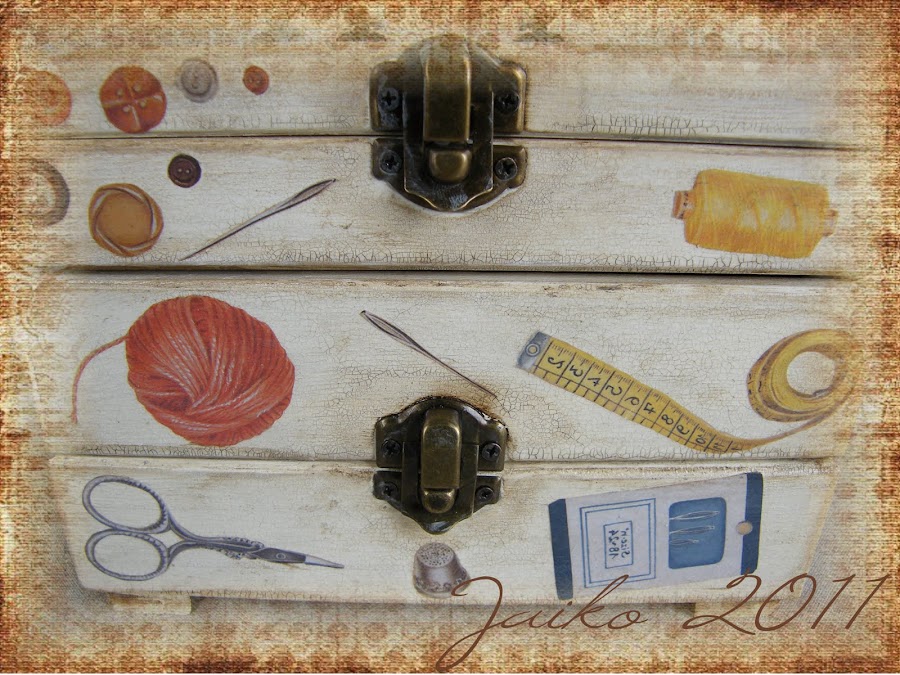 Ya sé que suena raro, pero os explico... mis grandes pasiones en el campo de las manualidades, (si, tata, si, en otros campos tengo otras, pero eso otro día jejeje), son estas, la costura y el cambio de imagen de la madera, con decoupage y algunas técnicas más en las que intento mejorar día a día, asi que en este trabajo sin querer, se han unido las dos, decorando este pequeño costurero de madera con papel y telas estampadas con motivos de costura, tendré a la vista cuando me ponga a darle a la aguja ambos placeres, jejejeje