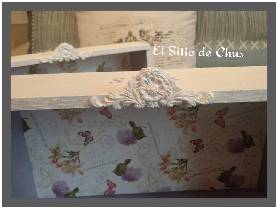 La parte de fuera la pinté de blanco y la de dentro de color lila, son los colores que tiene la habitación de las niñas. Pegué en el fondo ese precioso papel del que afortunadamente tenía suficiente para las dos estanterías. El detalle del molde las hacía más románticas verdad?