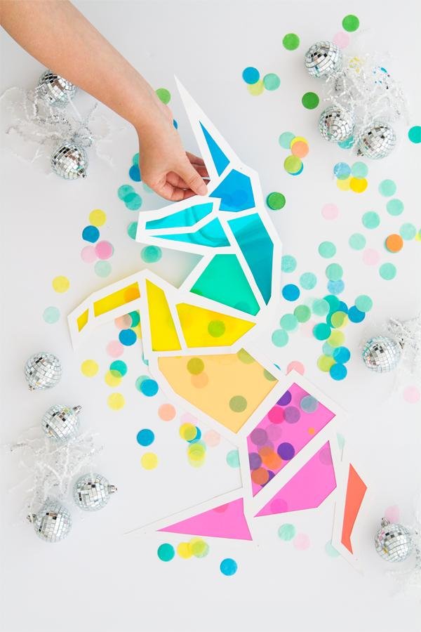 plantilla, impresora y papel imprimibles para unicornio, cartulina blanca de 22 "x 28", tijeras, lápiz, borrador, cuchillo x-acto, regla, geles de acetato de colores, sharpie, cinta transparente, perforadora, cuerda