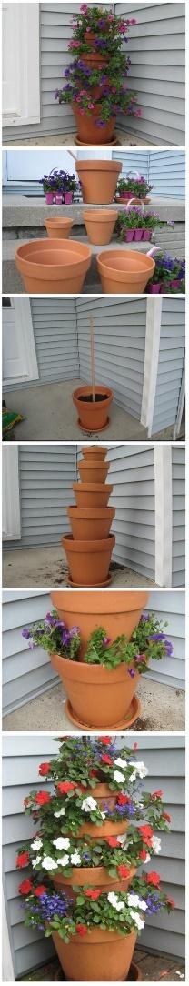 Otra buena idea es colocar una maceta encima de otras ordenándolas por tamaños. Y para que estas no se caigan o se ladeen puedes colocar en medio un palo de madera o varilla.