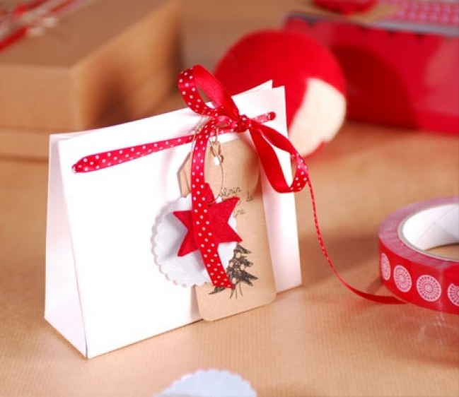 Solo necesitaras cintas y adornos navideños, para transformar una bolsita blanca en un envoltorio super original.