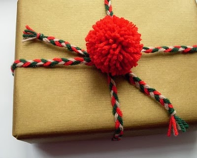 Decoramos con una cinta de lana en distintos colores navideños y lo decoramos con un pompón de lana.