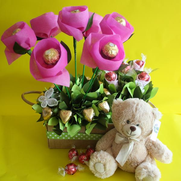 Espectacular arreglo de rosas con papel crepe y chocolates