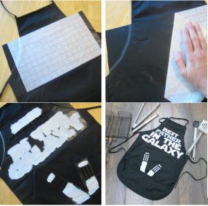Compra un delantal, si te gusta negro utiliza pintura blanca, y si te gusta blanco pintura negra o de otro color. Puedes utilizar la misma técnica de la choporeceta del Sr Papá pero con la frase que quieras.