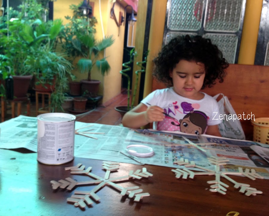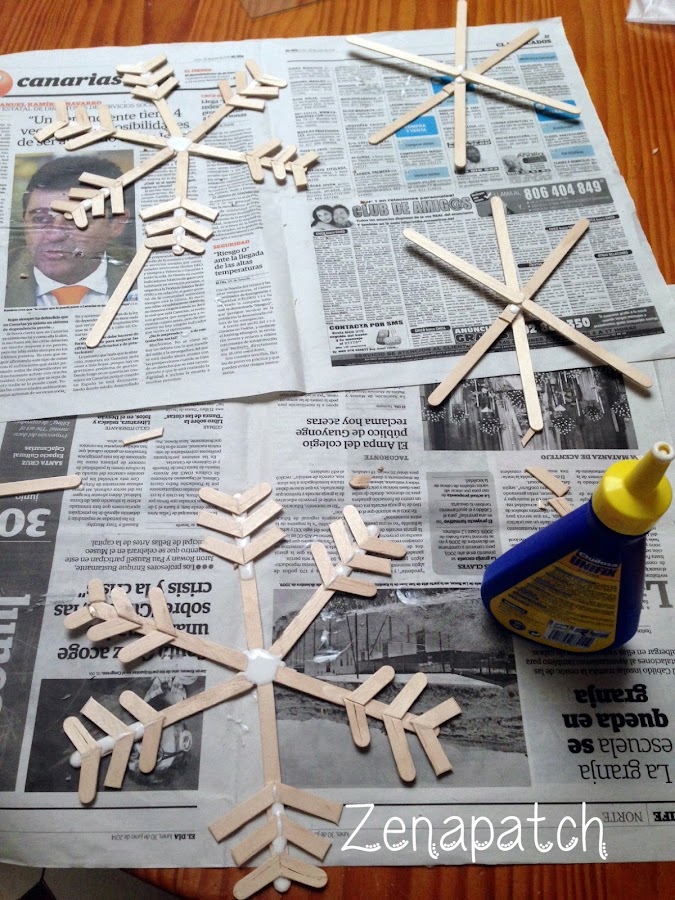 Vuelve a coger un molde de algún copo que te guste y simplemente vete colocando palitos y encolándolos hasta conseguir la forma que quieras que tenga. Estos sí que los puedes hacer con niños sin problemas, así se involucran mucho en su cumple y les hace -aún- más ilusión...
