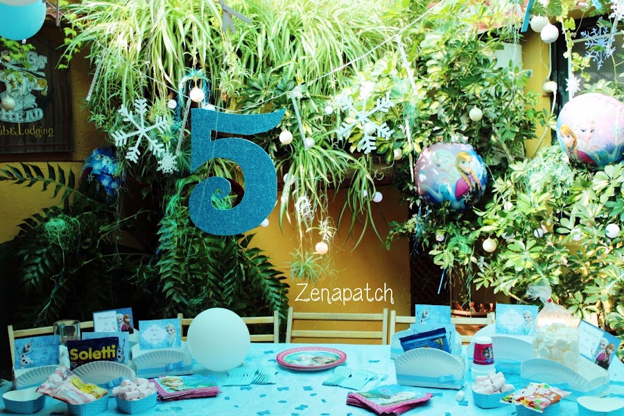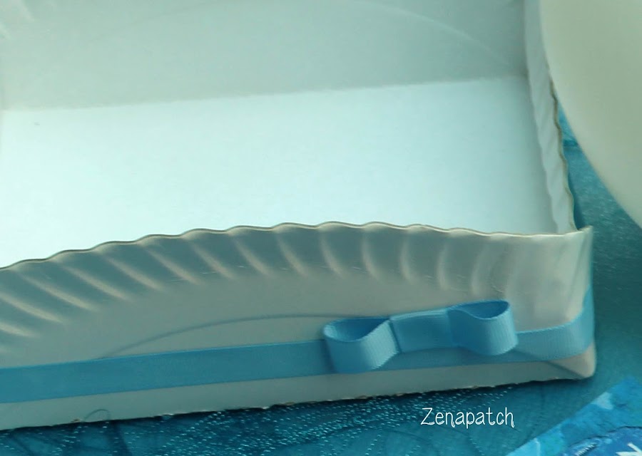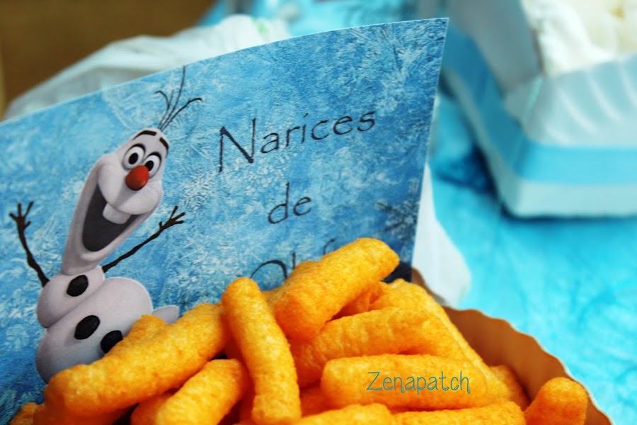 Es otra cosa también muy fácil y vistosa, a mis invitados les encantó! y sólo necesitas bandejas de cartón y cinta adhesiva! Si quieres darle un toque más Frozen, utiliza algún detalle en azul; yo compré un rollito de cinta grosgrain, la rodeé y le hice un lacito que pegué con un poco de cinta de doble cara.